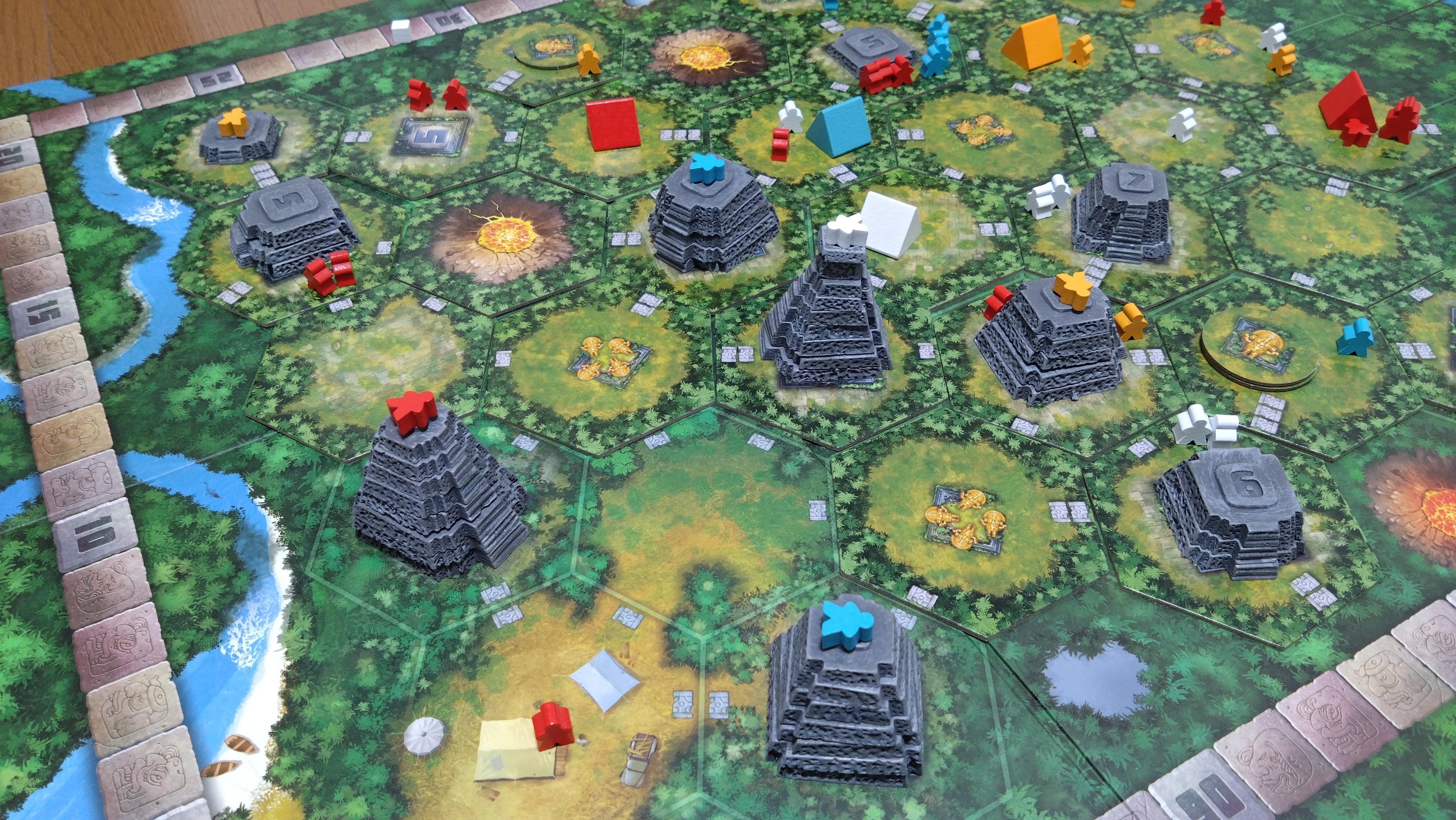 加えて、新版はコンポーネントがかなり豪華になった。特にプラで出来た神殿がボード上に積み上がっていくのは圧巻。人も人型をしているので、本当に見応えがあります。