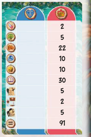 未使用の建設トークン: 未使用の建設トークン(開始いかだを含む)が2つあり、合計 2★を獲得します。 ビルダービーバー:彼は自分の村を先に終えてビルダービーバーを取ったため5★を獲得します。 |