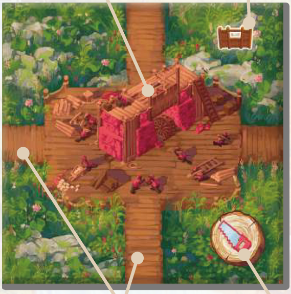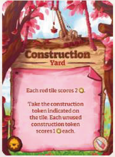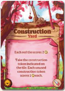 ヤード 開始スコアカード:各赤タイルは常に2★を獲得します。さらに、右上隅のアイコンに示されているように、各赤タイルは獲得時に建設トークン1つを提供します。 トークンは、タイルが獲得されたとき、しかしタイルが配置される前に取得されるため、そのトークンを使用して、それを提供した赤タイルを配置することができます。 未使用の建設トークン(単色いかだを含む)にはそれぞれ1★が付与されます。 建設トークンは、アクションルールに従って使用できます(4ページ)。 |