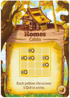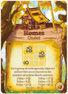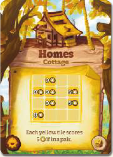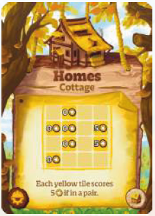 コテージ 開始スコアカード: 各黄タイルはペアの場合5★を獲得します(言い換えると、黄タイルの各ペアは合計10★)。単一の黄タイル、および3つ以上の黄タイルのグループは、0★。 黄タイルは、ペアを形成するために接続する必要はなく、隣接するだけで十分です。 |