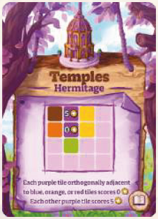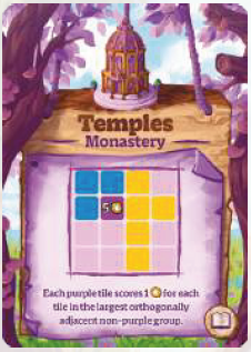 修道院 各紫タイルは、縦横に隣接する最大の紫以外の色のグループのタイルごとに1★を獲得します。 同じサイズの2つのグループに隣接する紫タイルは、一方のグループに対してのみスコアを獲得します。 紫タイルは、スコアを獲得するためにそのグループに接続する必要はなく、隣接するだけで十分です。 |