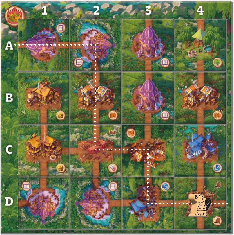タイルをスコアリングした後、プレイヤーはトークンを得点化します。 ビーバートークン:A1からD4まで移動できるビーバートークンを持っています(点線を参照)。これには茶色のタイルが含まれ、スコアは5★です。 |