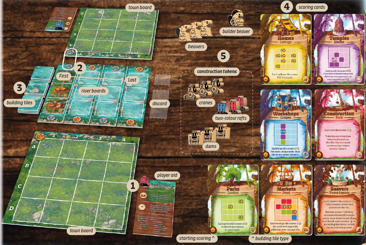 2. 最近ビーバーを見たプレイヤーが先にターンを行います。ファーストプレイヤーの街ボードのアイコンに一致する川ボードが最初の川ボードになります。2つの街ボードの間に、最初の川ボードを配置し、他の3枚の川ボードをアイコンが交互に並ぶように列を作って配置します。