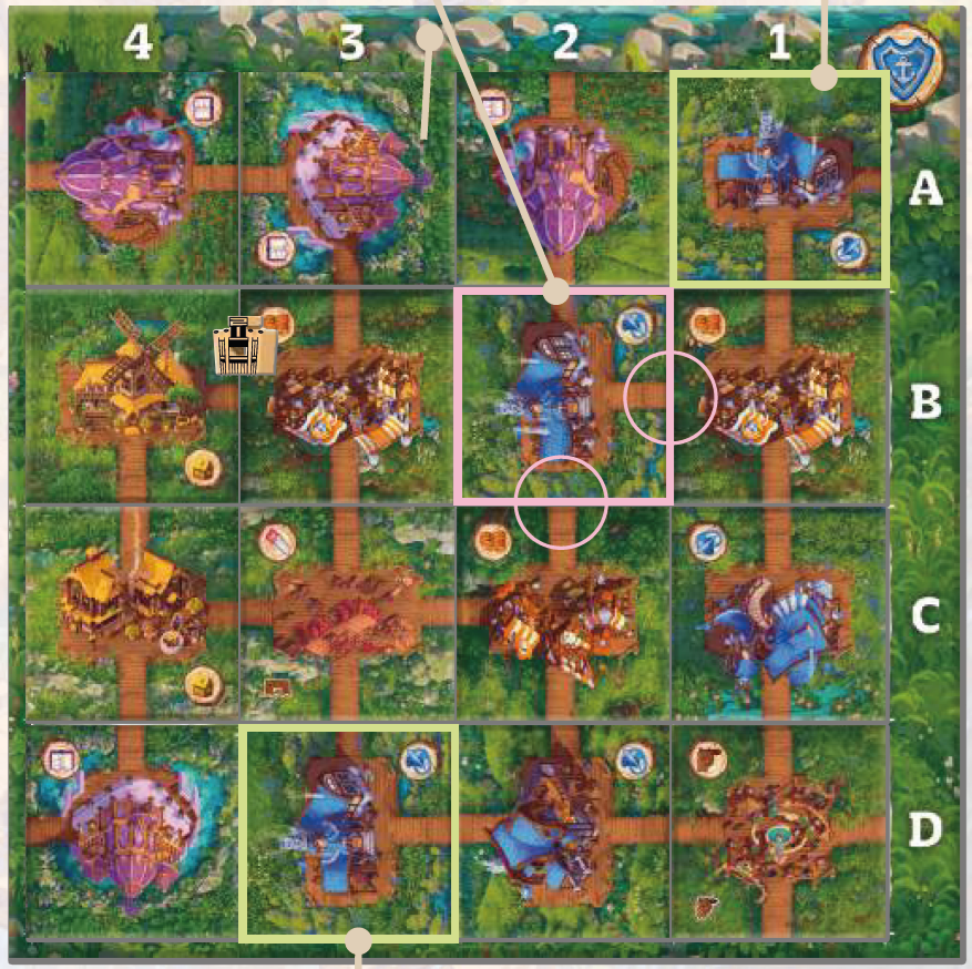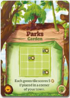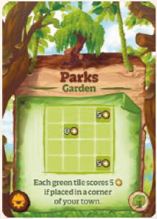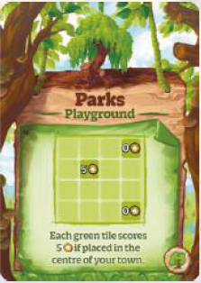 遊び場 各緑タイルは、街の中央に配置されると5★を獲得します。中央のスペース(B2、B3、C2、C3)以外の場所に配置された緑色のタイルは、0★です。 |