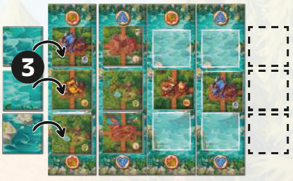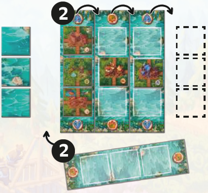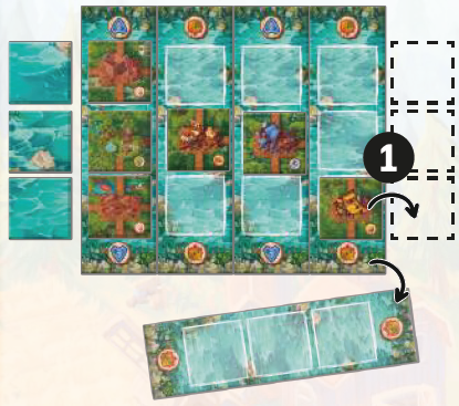 1. 最後の川ボード(ドロースタックから最も遠いボード)の建物タイルを取り除いて捨てます—これらの建物は回収することはできません。 その川ボードにある単色のいかだを所有者に返します。その川ボード上の他のトークンはすべて捨てます。 その川ボードを脇に置きます。 |