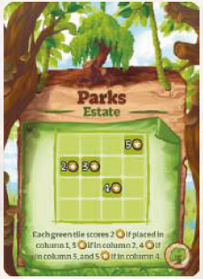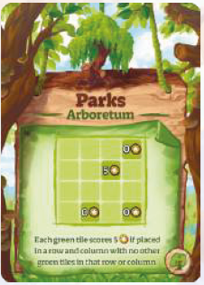 樹木園 各緑タイルは、その行または列に他の緑タイルがない場合、5★を獲得します。同じ行または列に他の緑タイルが1つでもあれば0★です。 |