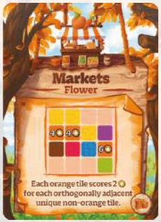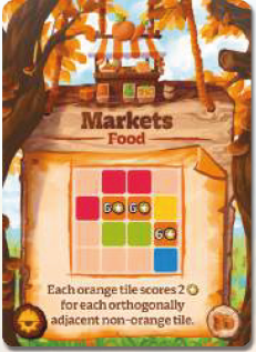 食品 開始スコアカード: 各橙タイルは、縦横に隣接する橙以外のタイルごとに2★を獲得します。 橙タイルは、スコアを獲得するために他のタイルに接続する必要はなく、隣接するだけで十分です。 |