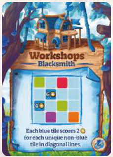 鍛冶屋 各青タイルは、対角線上の青以外のユニークなタイルごとに2★を獲得します。対角線は、スコアリングする青タイルを含み、斜めの4方向すべてで、それぞれ任意の長さに延長できます。 |