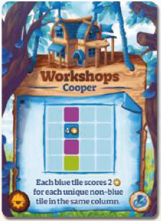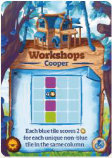 桶屋 開始スコアカード: 各青タイルは、同じ列内の青以外のユニークなタイルごとに2★を獲得します。 |
