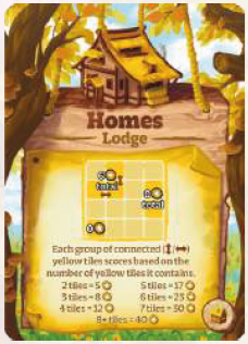 ロッジ 縦横に隣接する黄タイルの各グループは、含まれる黄タイルの数に基づいてスコアリングされます。 グループ内の黄タイルは、スコアを獲得するために接続する必要はなく、隣接するだけで十分です。単独の黄タイルはスコアリングされません。