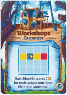 大工 各青タイルは、同じ行内の青以外のユニークなタイルごとに2★を獲得します。 |