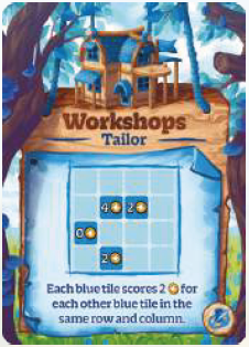 仕立屋 各青タイルは、同じ行と列の他の青タイルごとに2★を獲得します。 |