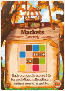 贅沢品 各橙タイルは、斜めに隣接する橙以外のユニークなタイルごとに2★を獲得します。同じの色のタイルは複数枚あっても1回のみカウントされます。 |