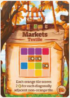 織物 各橙タイルは、斜めに隣接する橙以外のタイルごとに2★を獲得します。 |
