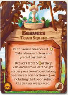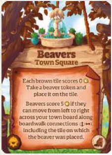 タウンスクエア 開始スコアカード:茶色のタイルはスコアリングされません。代わりに、それらはビーバートークンを提供し、川から取った後、その茶色のタイルの上に配置する必要があります。 各ビーバートークンは、あなたの街ボードの左端から右端に(1列目から入り、ボードを横切って4列目から出ます)接続された歩道を通って移動できる場合、5★を獲得します。 通る経路には、ビーバーが最初に置かれていた茶色のタイルが含まれている必要があります。 |