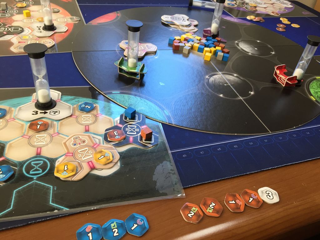 その間に宇宙をあっちこっち行って、母星では資源をえっちらおっちら作ったり、改善したりして、需要を消費、得点(他のプレイヤーの需要マーカー)を集める、最初ののんびりはどこへやら? って感じのゲームです。
