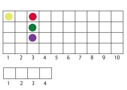 ・あるラウンドのはじめに,手番順が赤,緑,紫,黄だったとして,手番順のマスに各色のマーカー(円板)を置いておきます。