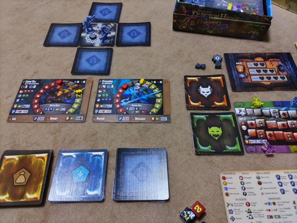 「Tiny Epic Dungeon」は1人から4人までプレイできるダンジョン探索ゲームです。ヒーローはダンジョンに入って部屋を探索し、アイテムや呪文を見付け、罠を回避・解除し、ゴブリンやミニオンと戦い、ボスの隠れ家を目指します。隠れ家を見付けたらボスを守っている祭壇をすべて除去して、ボスを倒せばヒーローが勝利します。しかし時間は有限です。暗闇のダンジョンを探索するのに必要なトーチが途中で燃え尽きると、ヒーローは敗北します。