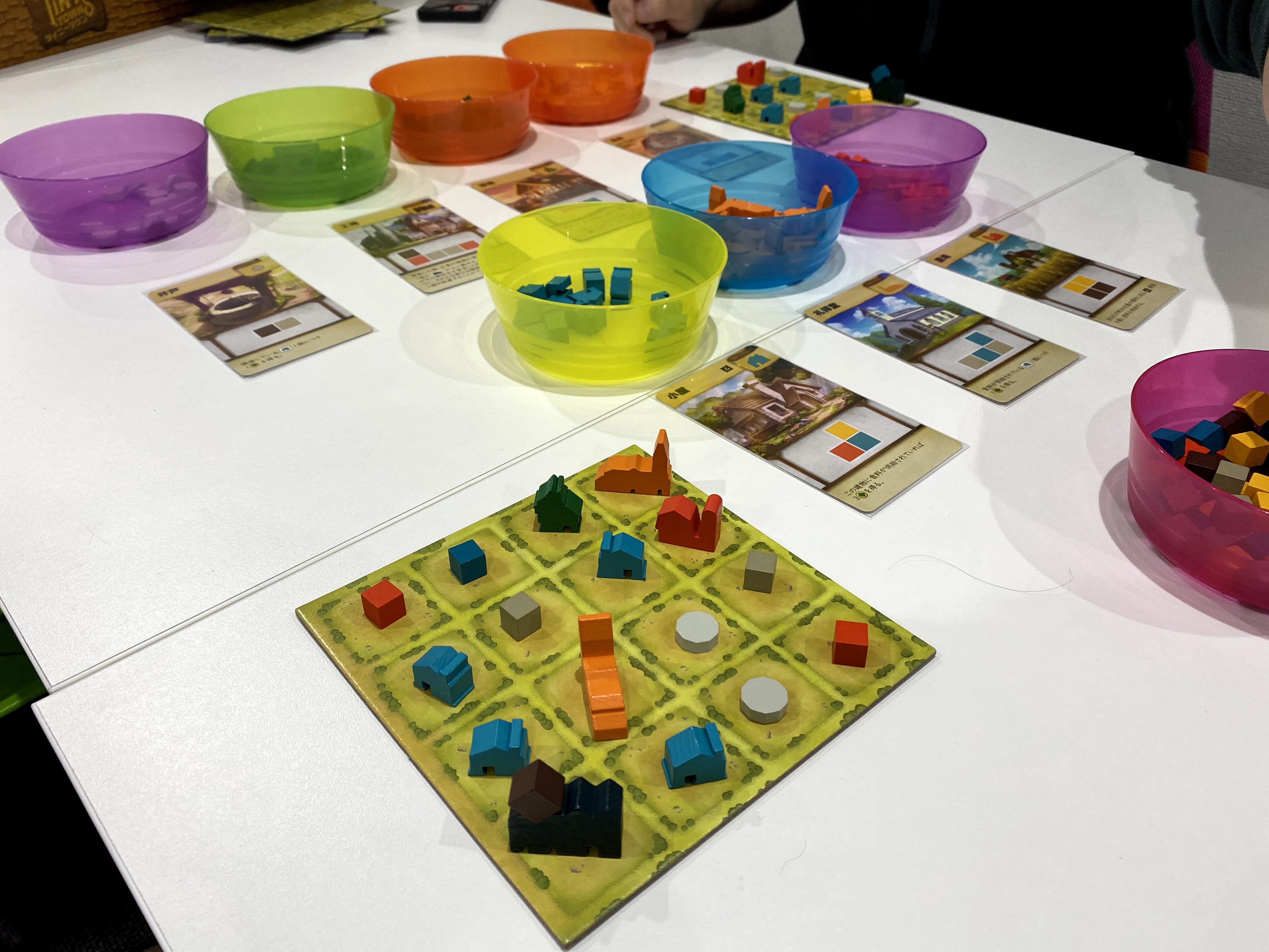 自分のターンで宣言した資材を取って4✖️4の自分の街の空いているスペースに資材を置く。他の人のターンでは宣言された資材をとって、空いているスペースに資材を置く。そのため他の人のターンでもやることがあるので待ち時間はかなり少ない方です。