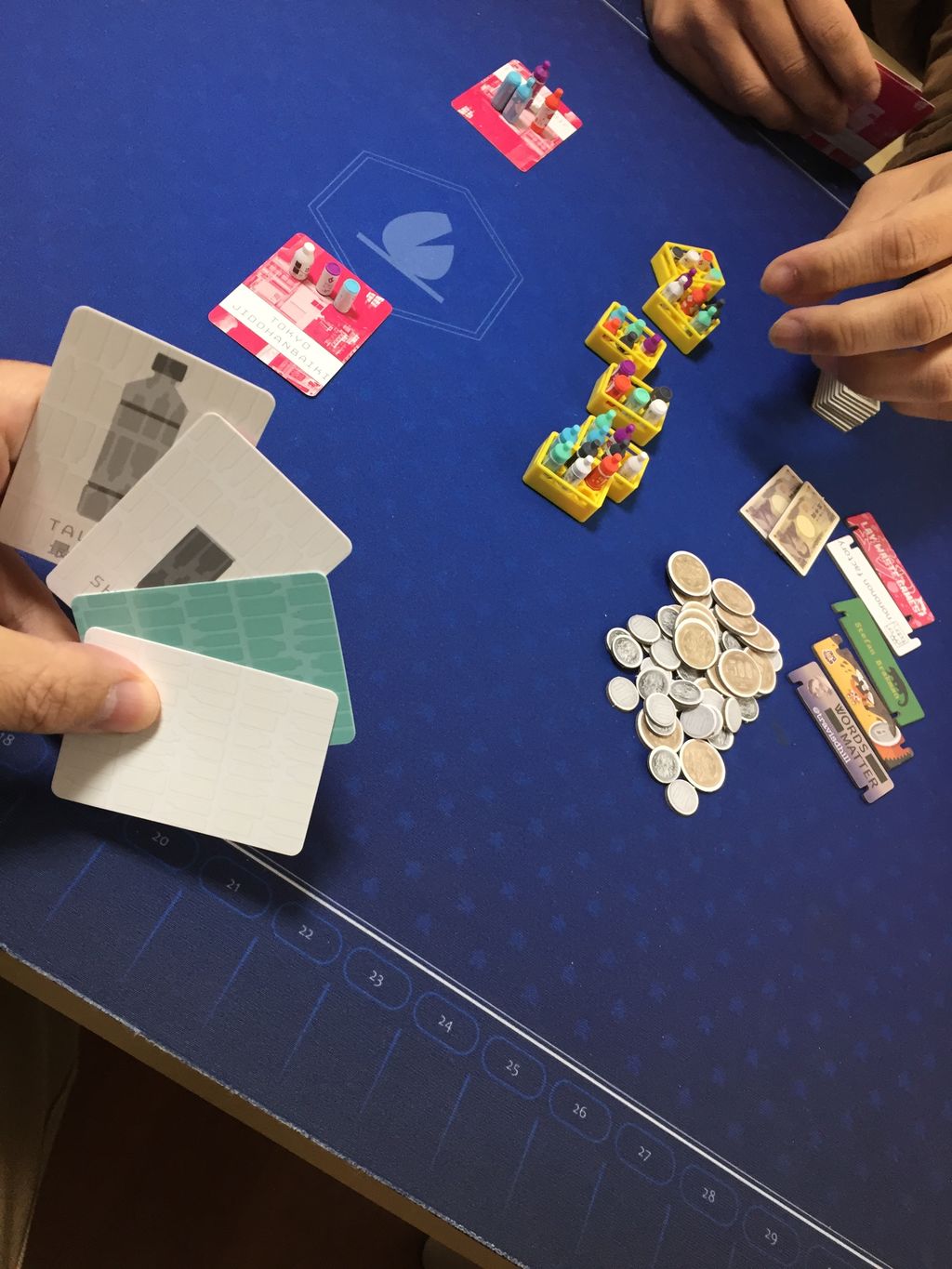 手番では、ボトルを1つ選んで近くのカードの上に乗せるか、お金を払って(合計4回出来る)相手のボトルをまとめて自動販売機(ダイスタワーみたいなギミック、中で引っかかる場合もある)の中に入れて、出てきた分だけ、元に戻します。