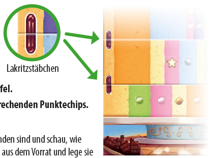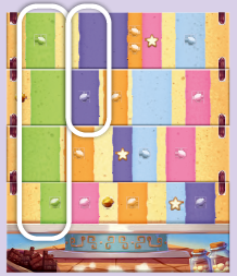 a.) 新しく作成したケーキピースによってケーキのどのカラーストライプが互いに接続されているかを確認し、接続されたストライプに描かれている角砂糖の数を確認します。対応する角砂糖をサプライから取り出し、とりあえずボードの隣に置きます。