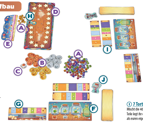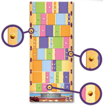 ゲームの過程で、ラウンドごとに常にケーキピースを1つ置くことで、ケーキプレートの上に多層のケーキを徐々に作ります。ケーキピースのカラーストライプをできるだけ巧みに組み合わせることが目的です。