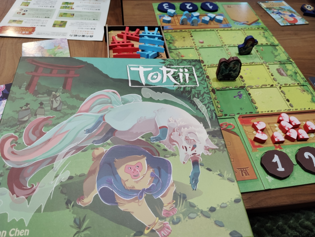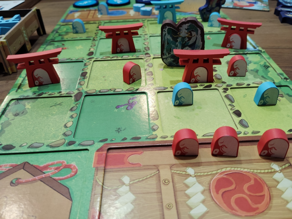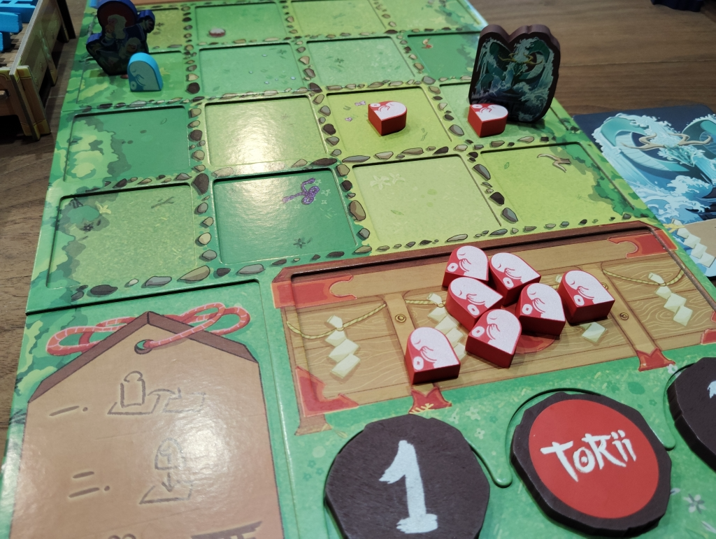 先に4つの鳥居を建設するか9人の信奉者を各地に配置できれば勝ちの2人用のゲーム。