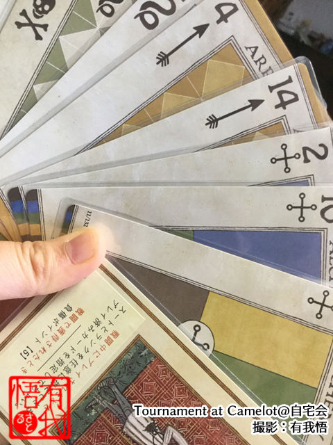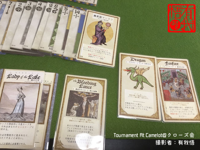 また、各スートはキャラクターと紐付けられていて、アーサー王はソードのスートが有利に働くとか、Disenpushon(欺瞞)スートはモードレッドに影響を与える等の特殊能力があります。アーサー王のコンパニオン・エクスカリバーの能力が「自分が食らったソードスートのダメージを2倍にして全員に食らわせる」というもので、初プレイでは、このコンパニオンのおかげで全員アーサー王に虐殺されての逆転勝利という顛末でした。なんだこれは。