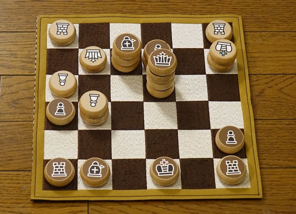 ゲーム自体大変面白くて,先日もゲーム好きの人が集まるところでプレイしました.外国人もいたのですが,ポーンが味方のポーンに乗るのは斜め前なのか,直前なのかでちょっと迷いました.斜め前と説明しておきましたが,これでいいのですよね? ともかく,卓抜なる発想のゲームデザインで,本当に感心しました.