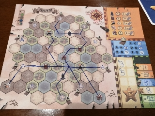 後半ラウンドも同様にカードが13回めくられたら終了し、ゲーム終了時は村同士が繋がったポイント、先に村に辿り着いたボーナス、アイコン到達ポイント(これは前後半する)を合計して得点が高いプレイヤーの勝ちになります。凝った特殊能力もないので、遊びやすい紙ペンゲーム。