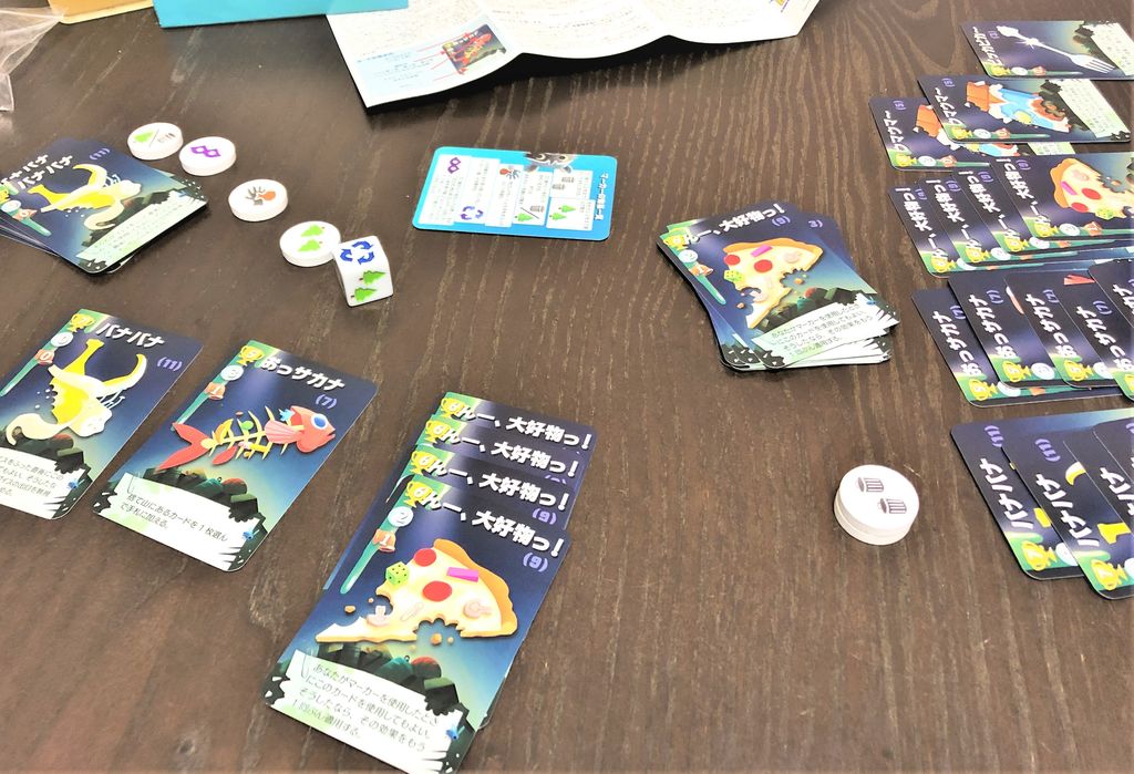 カードのアクションがいろいろあるとはいえ、ぱっと読んでわかる程度ですし、ゴミ箱から出てきたものがアライグマにとってお宝なんだな~っていうのがわかるカードで、見ていて楽しいです。ボードゲームモチーフのゴミがちょっとピザにくっついてたりして、可愛い……!