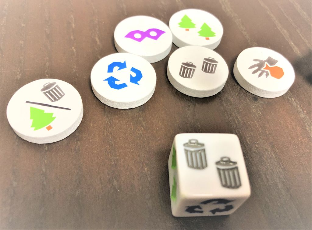 ダイスの目にはいろんなアクションがあって、ゴミ箱のマークは山札を引くアクション、木のマークはカードを隠すアクション、他にも人の手札を盗むアクションなど様々です。出た目に対応するアクションを行い、手番終了です。