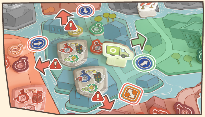 例: 緑プレイヤーのトラックは右のセクターに移動できます。 他の方向へは、一方通行に逆らっているため、または交通規制のある道を通っているため、罰金トークンを受け取らなければなりません。 |