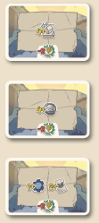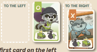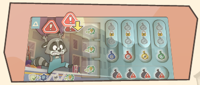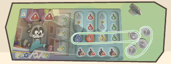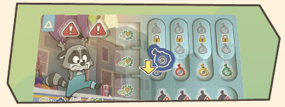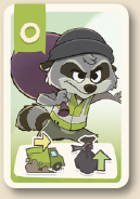 熟練アライグマカード3枚以上と技術タイル3枚を所有していること。 このラウンドで、異なるタイプのゴミ袋のペア3つと、同じタイプのゴミ袋のペア2つを配達すること。 少なくとも8コインを持っていること。 |