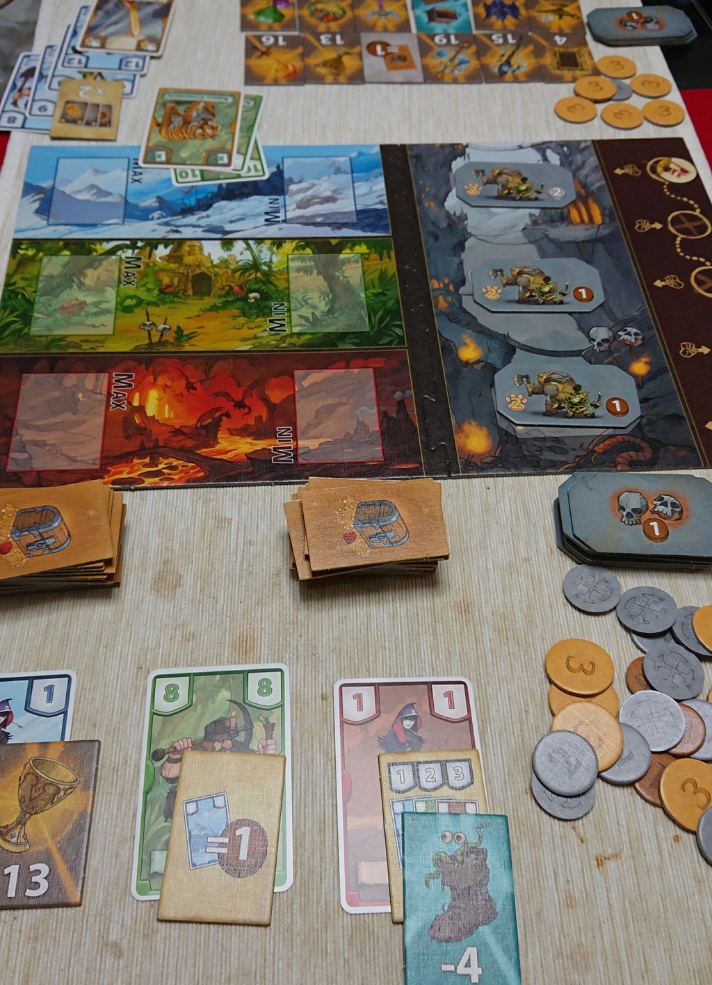 ドラフトで手に入れたカードを手に、3つの冒険先にある宝を獲得するため、相手の戦略を読みアクションカードを駆使しながら、さらにゴブリンからコインを奪われないように番犬で追い払いつつ、得点を重ねていく!