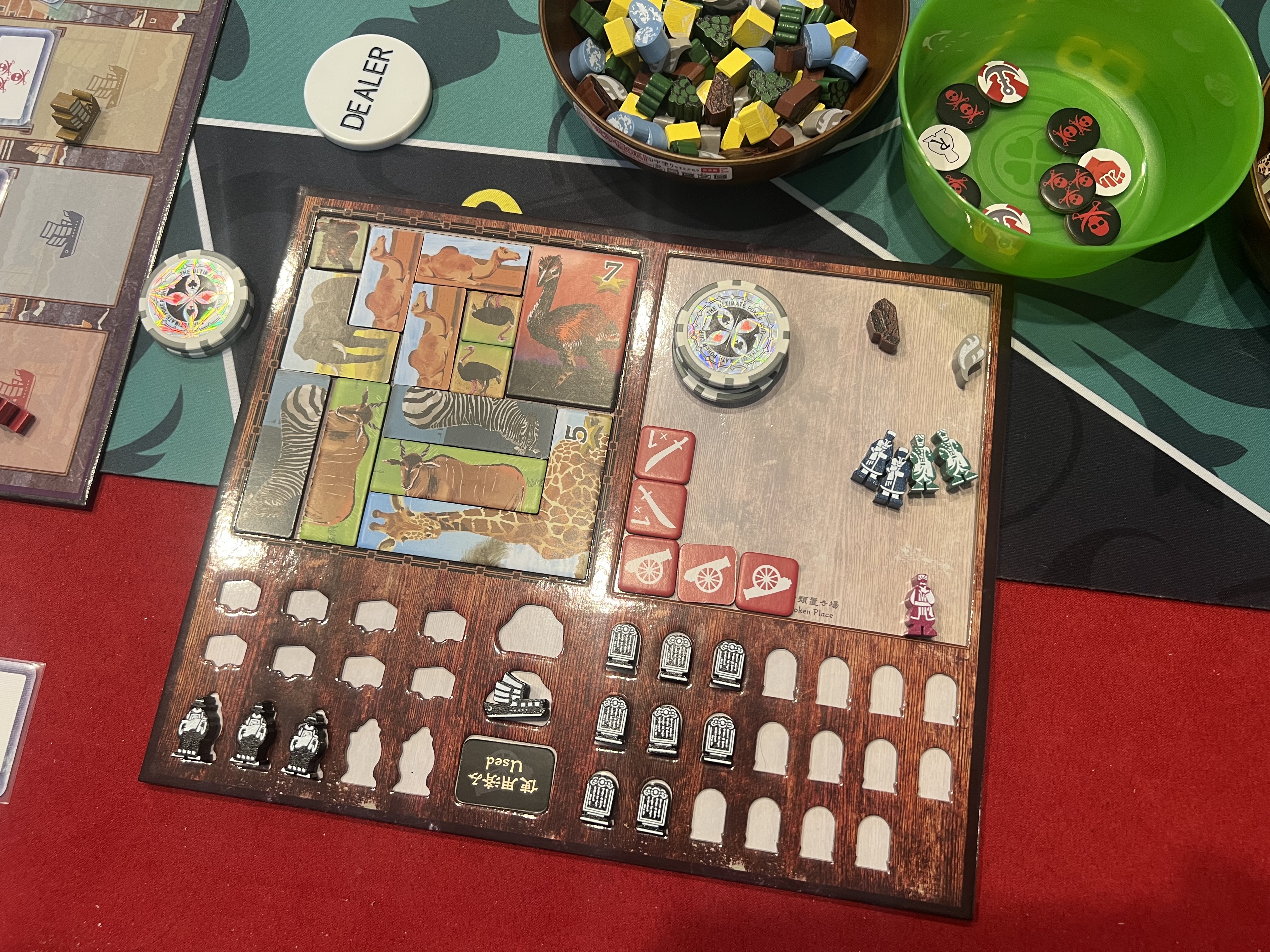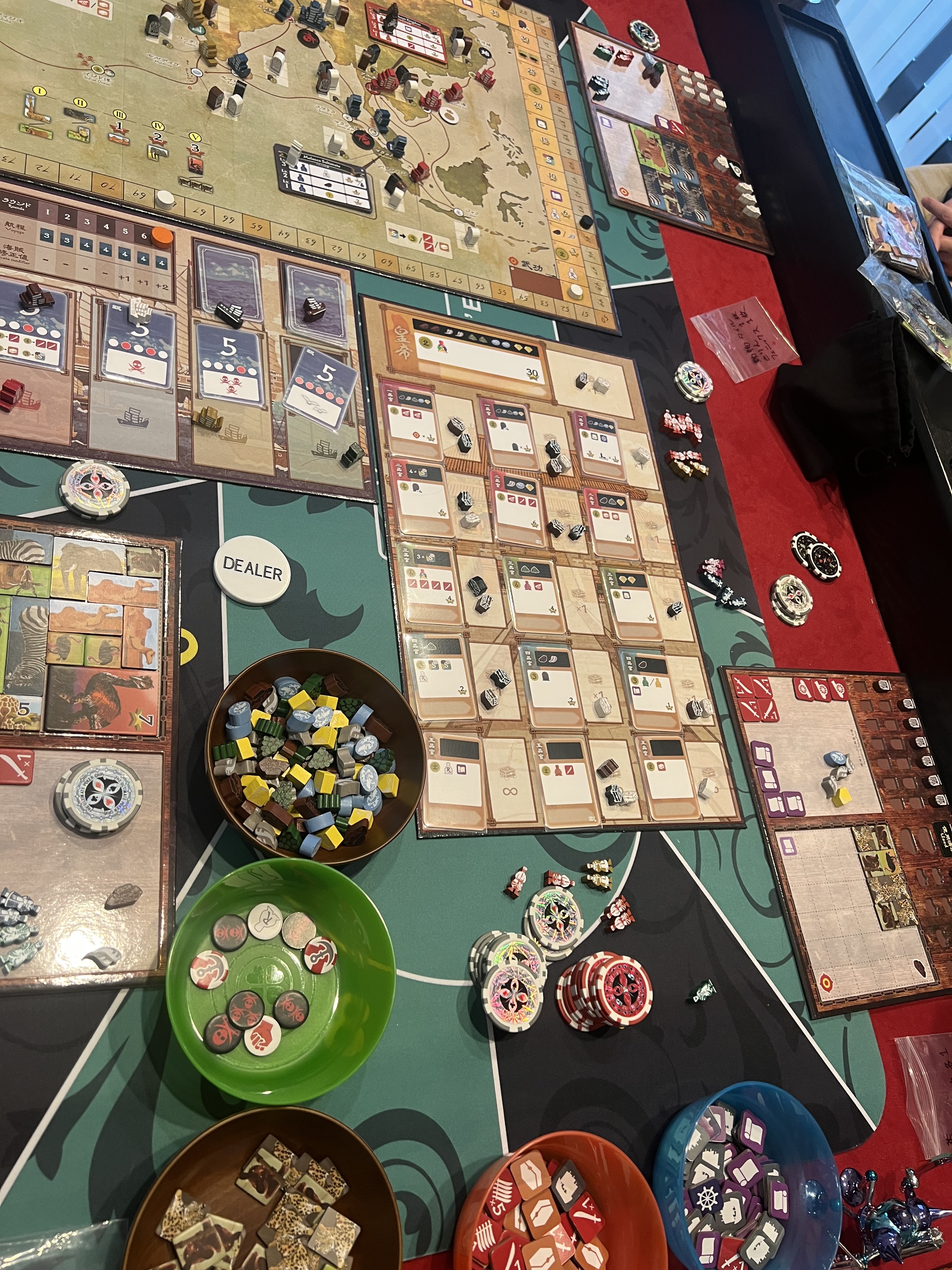 第1フェイズ「高官フェイズ」で、各プレーヤーは冒険に必要な物資を役人におねだりします。この役人というのが悪い奴ばかりで、役職が高ければ高いほどお金持ちなので、それに応じて良い物資をくれるわけですが、要求してくる賄賂も半端ないのです。そう、こちらの足元を見てくるわけです。当時の悪徳政治家の実態を表現しつつ、プレーヤーのジレンマ(いいものおねだりしたいけど、賄賂は少ないほうがいい...or、賄賂は温存したいので、おねだりは最小限に...)というゲームシステムが見事に合致しています。