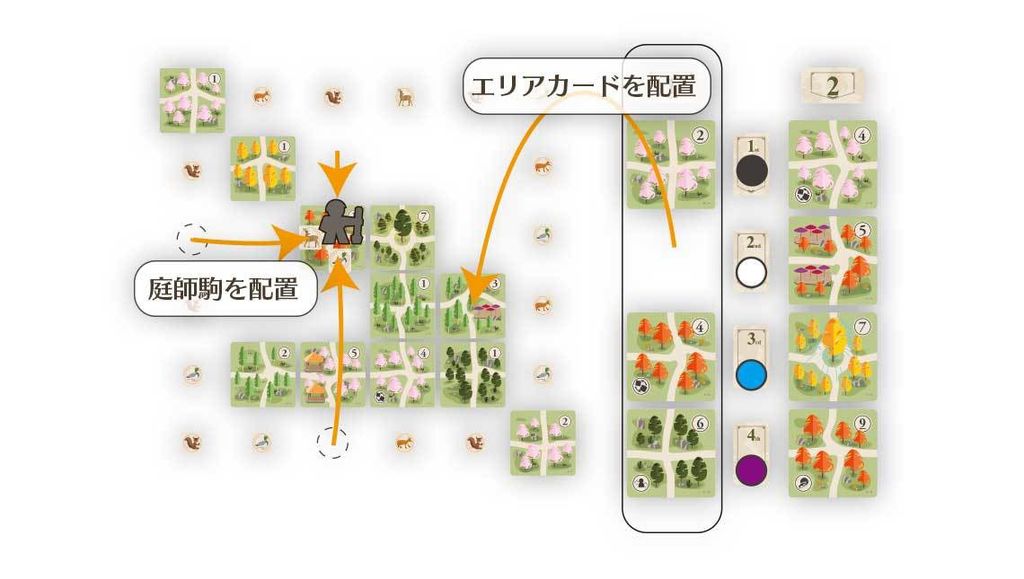 ■ゲームの流れ手番では左側の列に有る好きなエリアカードを1枚選んで公園に配置し、アクション駒が手番順タイル1stに有るプレイヤーから手番を行います。続いて2nd、3rd、4thの順番で手番を行います。最後のプレイヤーが手番を行ったらラウンドが終了し次のラウンドの準備を行います。これらを繰り返し行い、36枚のエリアカードがすべて置かれるとゲームが終了します。