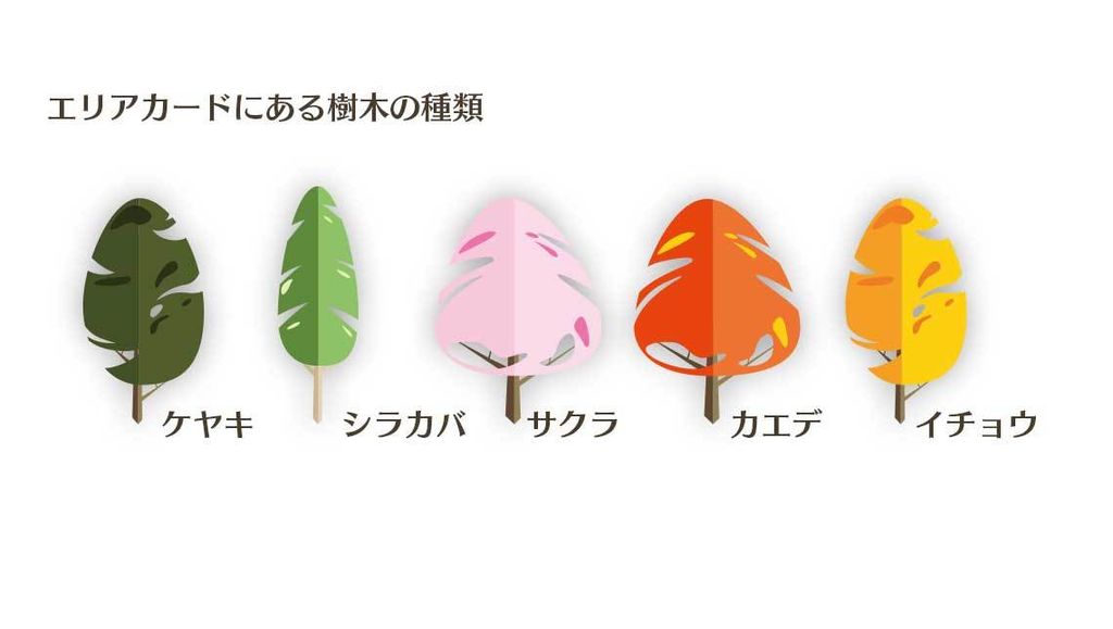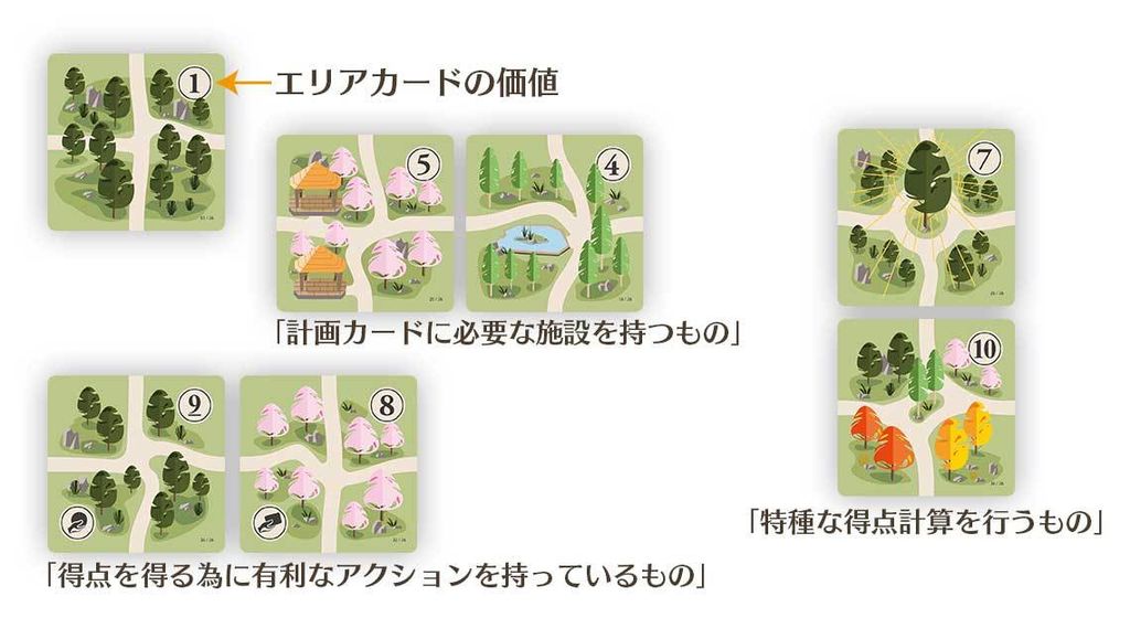 1~10の価値があり、5種類の樹木が有ります。いくつかのエリアカードには計画カードを達成する為の施設や、アクションアイコンがあります。