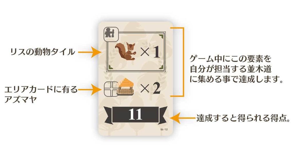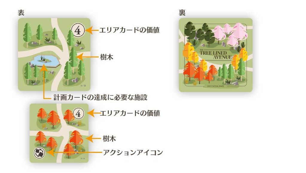 ■ゲームの終了エリアカードが6枚×6枚(36枚)すべて配置されるとゲームは終了します。自分が担当する並木道から得られる景観点と達成できた計画カードの景観点を足し合わせた合計が最も高かったプレイヤーが勝者となります。