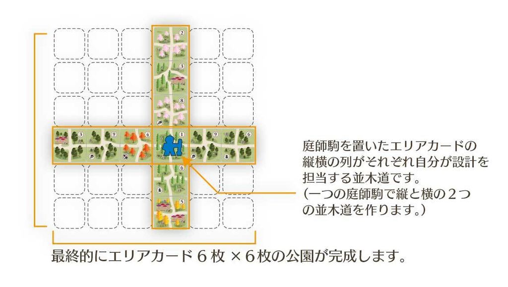エリアカード6枚分×6枚分の公園に手番順でカードを配置していきます。自分が担当する並木道を公園の中で最も良い環境にすることが目的です。その為には、なるべく同じ種類の樹木を持つエリアカードを自分の庭師駒を置いたエリアカードの縦横の列に集めます。