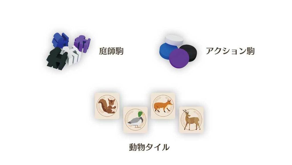 ■動物タイル庭師駒をエリアカードに置く時に、左右上下に置かれている動物駒を2つ取って庭師駒と一緒に置きます。これらは得点源となり、また集める事で計画カードを達成出来ます。