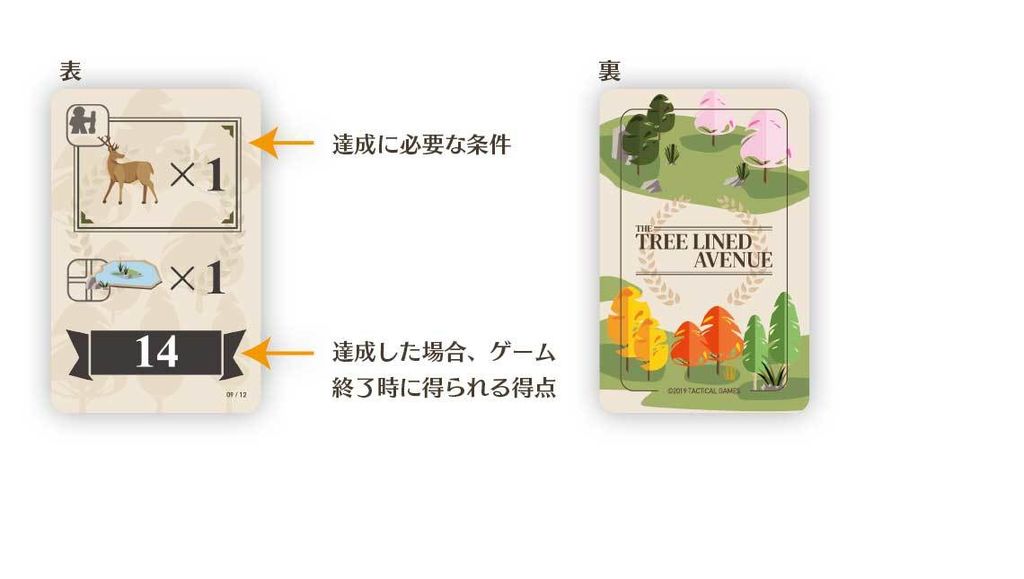 ゲームが終了したら、自分が担当する並木道と達成した計画カードの合計点を計算して合計点が最も高いプレイヤーが勝者となります。