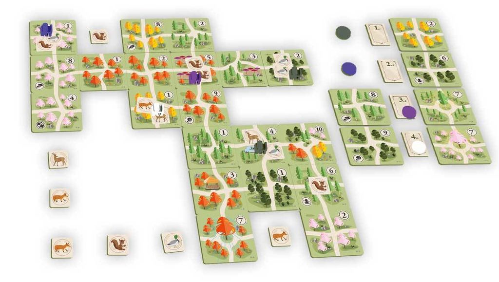 自分の手番では庭師駒をすでに公園に配置されているエリアカードの上に置くことができます。置いた場合、縦横の列から動物駒を2つまで取って庭師駒と一緒に置きます。庭師駒を置いた縦横の列を担当する並木道として、ゲーム終了時に得点を得ることができます。その後、エリアカードを1枚とって公園に配置します。こうして自分が担当する列になるべく同じ種類の樹木を集めていきます。