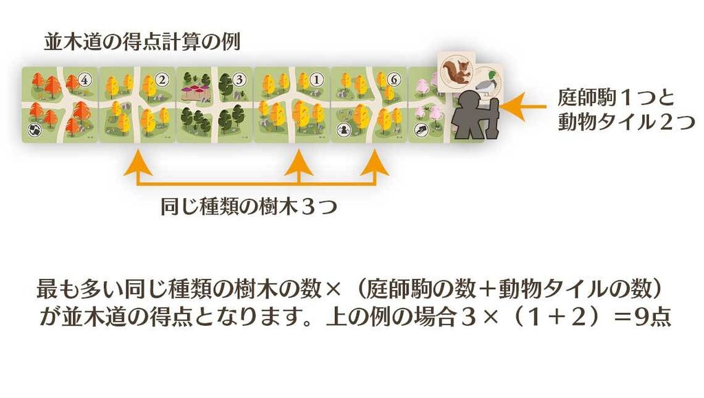1つの並木道から得られる得点を計算するには、その列に同じ種類の樹木がいくつ置かれているかを数えて置かれている動物タイルと庭師駒の数にかけて計算します。