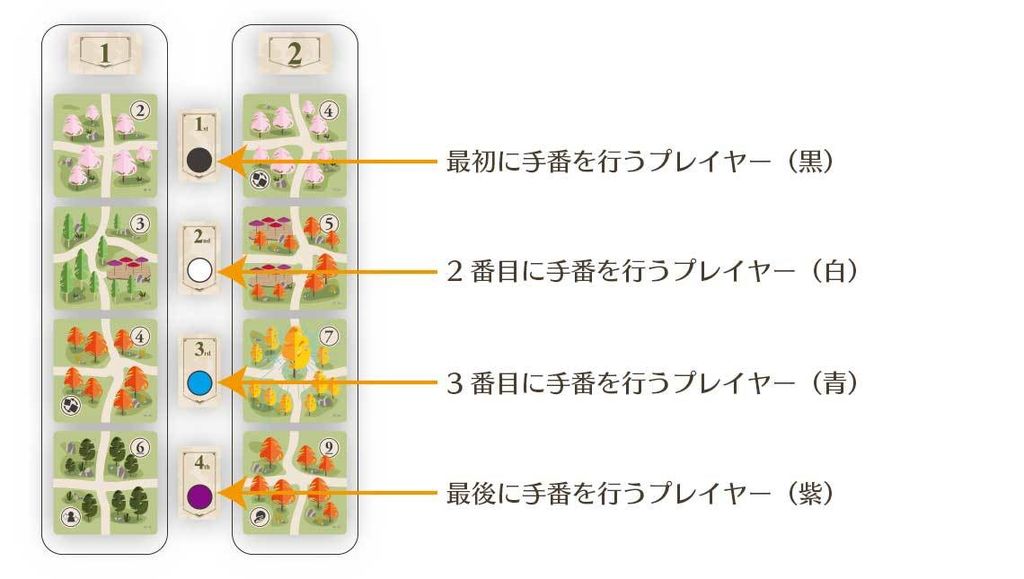 ■アクション駒手番順タイルの上に置かれたアクション駒の順番で手番を行います。