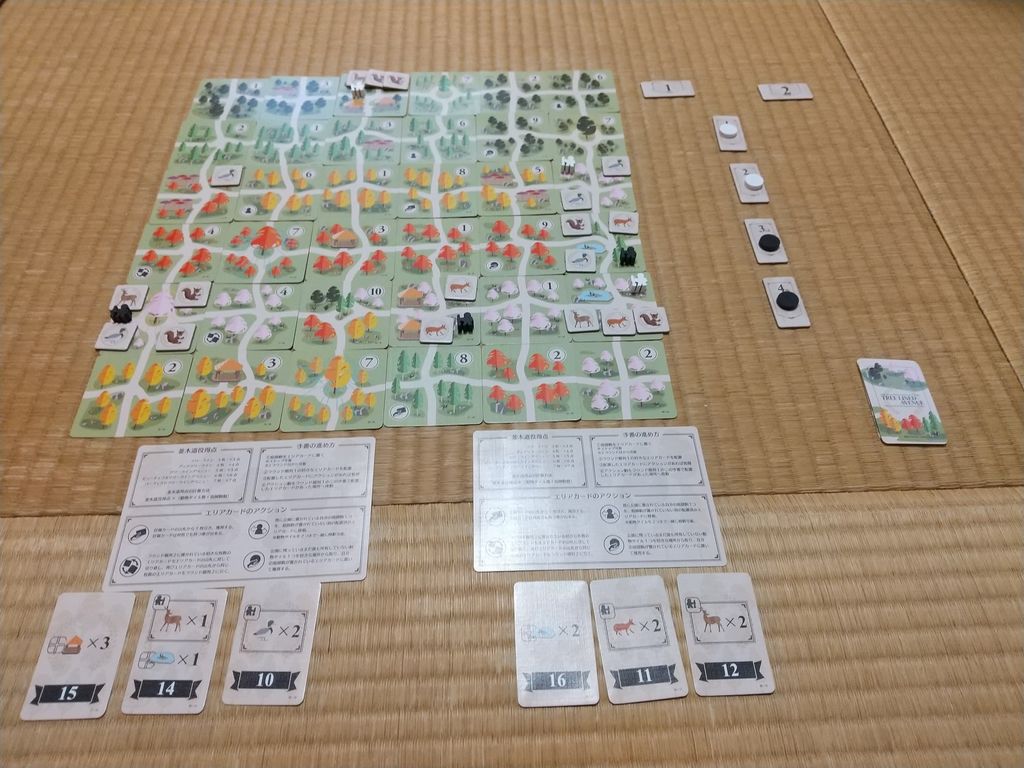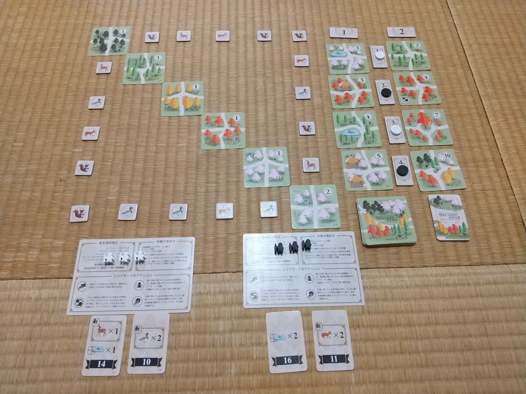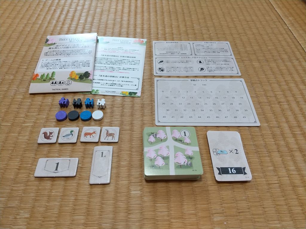 ・おすすめプレイ人数:このゲームは2~4人で遊ぶことが出来ます。しかし私がおすすめするのは3~4人です。2人プレイではドラフトゲームとしての性質上どうしてもお互いに邪魔のしあいになりがちです。それはこのゲームが複数人で各々の計画カードを達成しつつ美しい公園をつくるものであり、一対一で相手を妨害したりして得点を伸ばしていくことに馴染まないからです。※個人の見解です