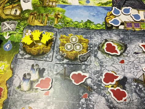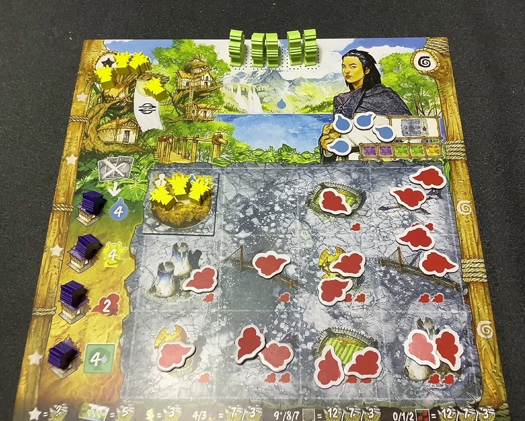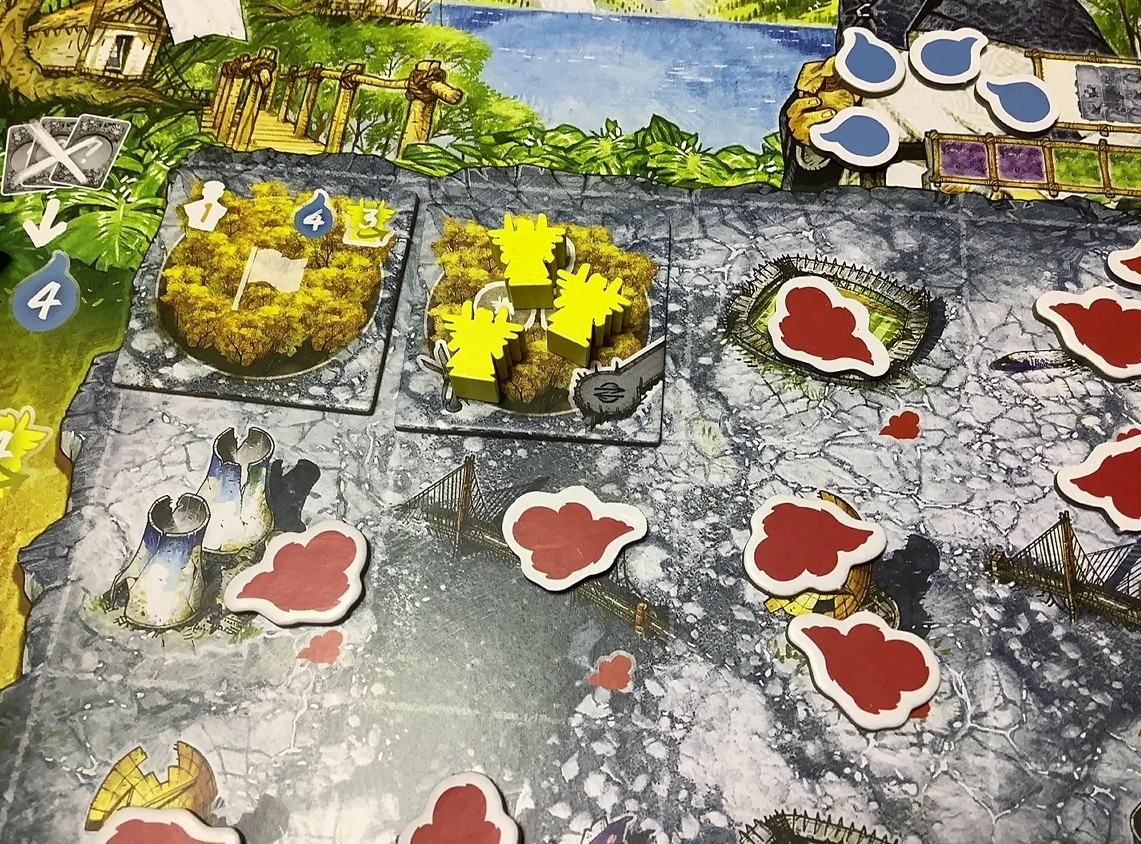 ボード上にある赤い雲みたいのが汚染されている地域で、これを除去できないと住処となる森が作れません。