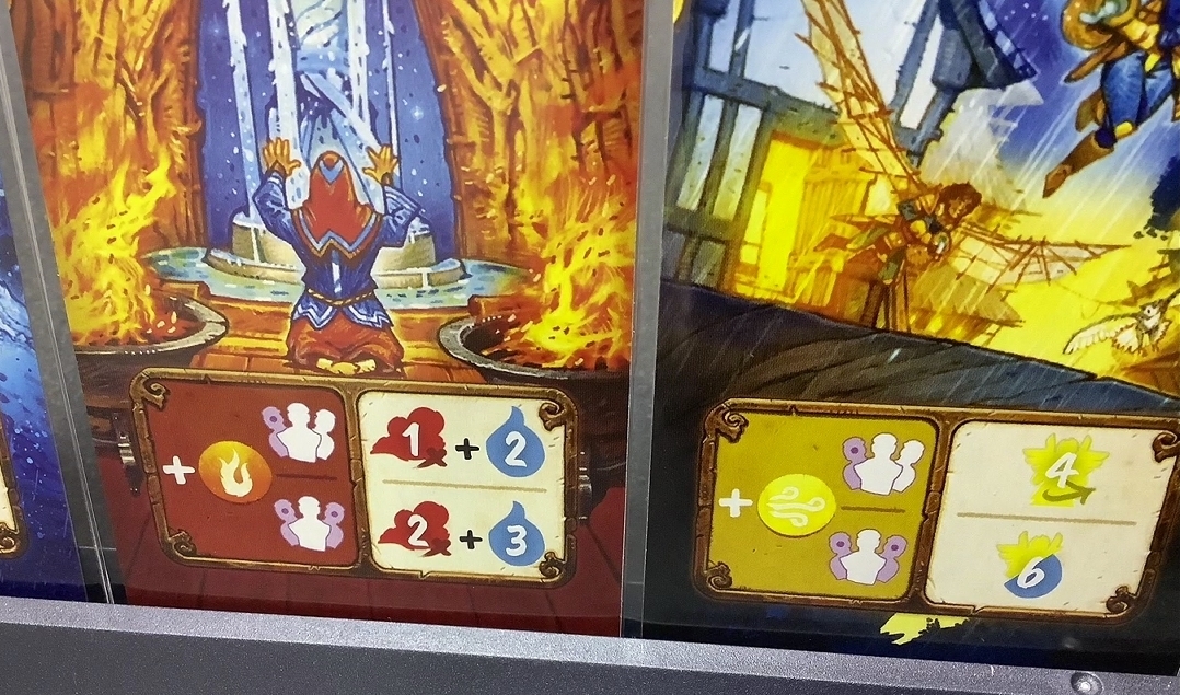 このゲームのプレイ条件が、自分の両端の人のカードの種類(エレメント)によって使えたり、威力がかわったりします。