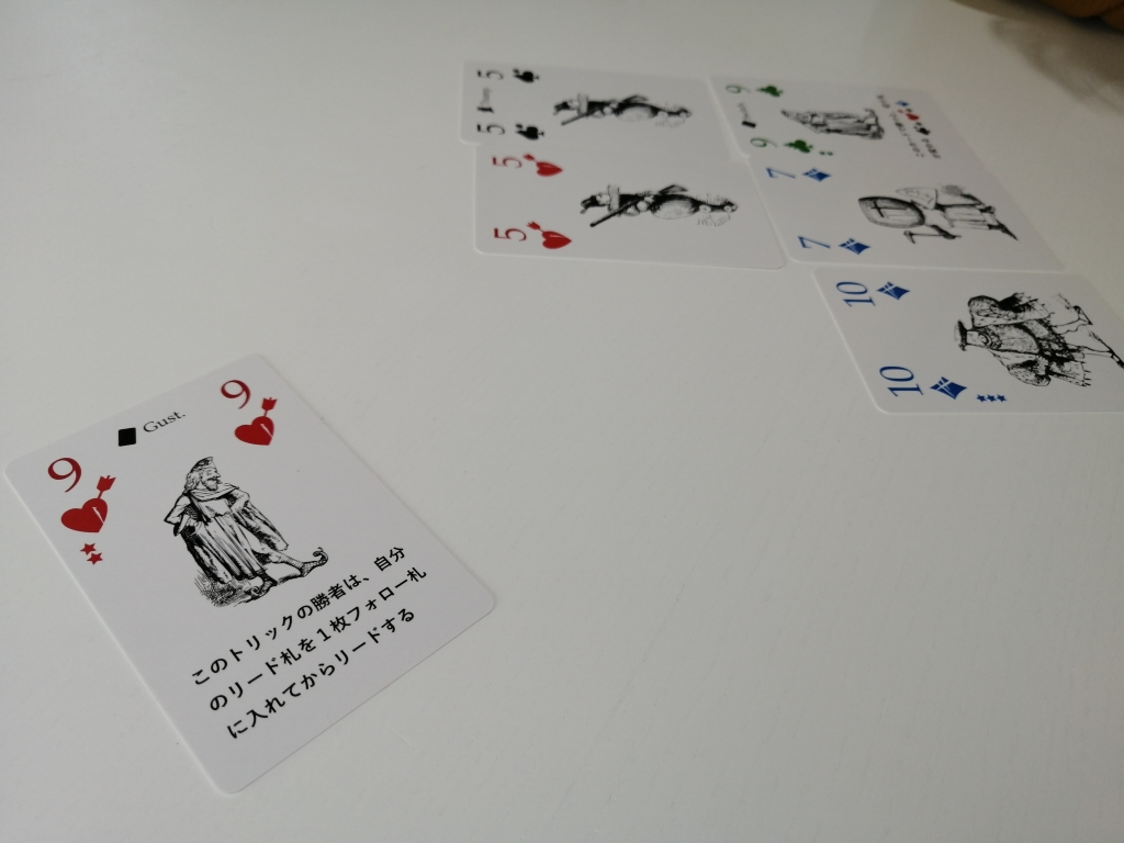 切り札は、はじめはスペードでスペードがあればスペードの勝ち。なければリードカラーの中で数字が高いプレイヤーの勝ちになります。
