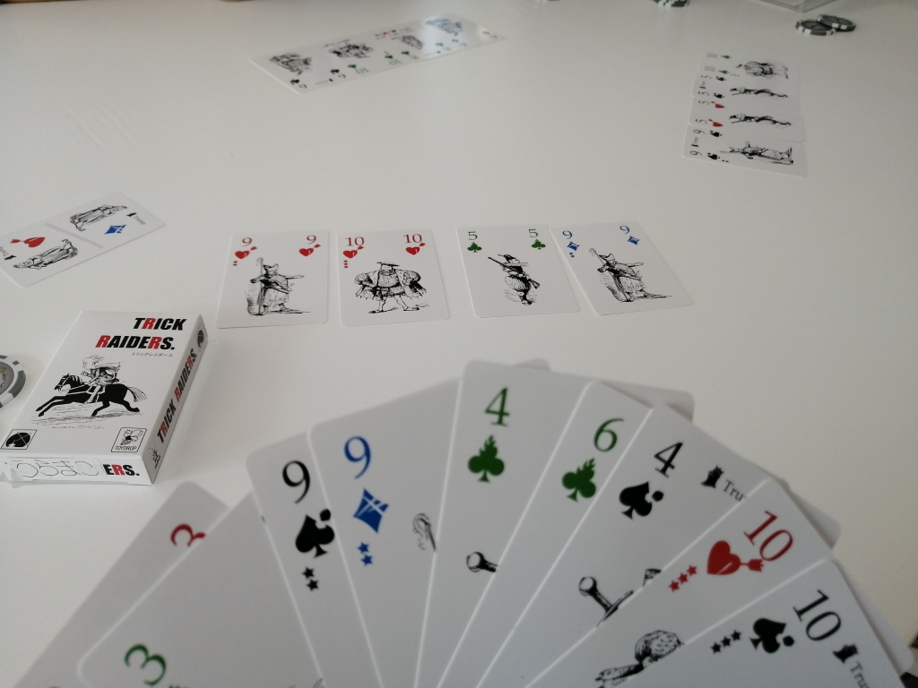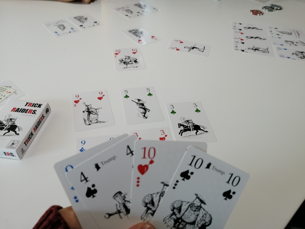 特殊なカードは2種類ぐらいで、手元と手札は別のカードてま勝ち方が難しいけど、自分含め3人とも初プレイで「これは面白い。」となりましたトリックテイキングゲームでした。